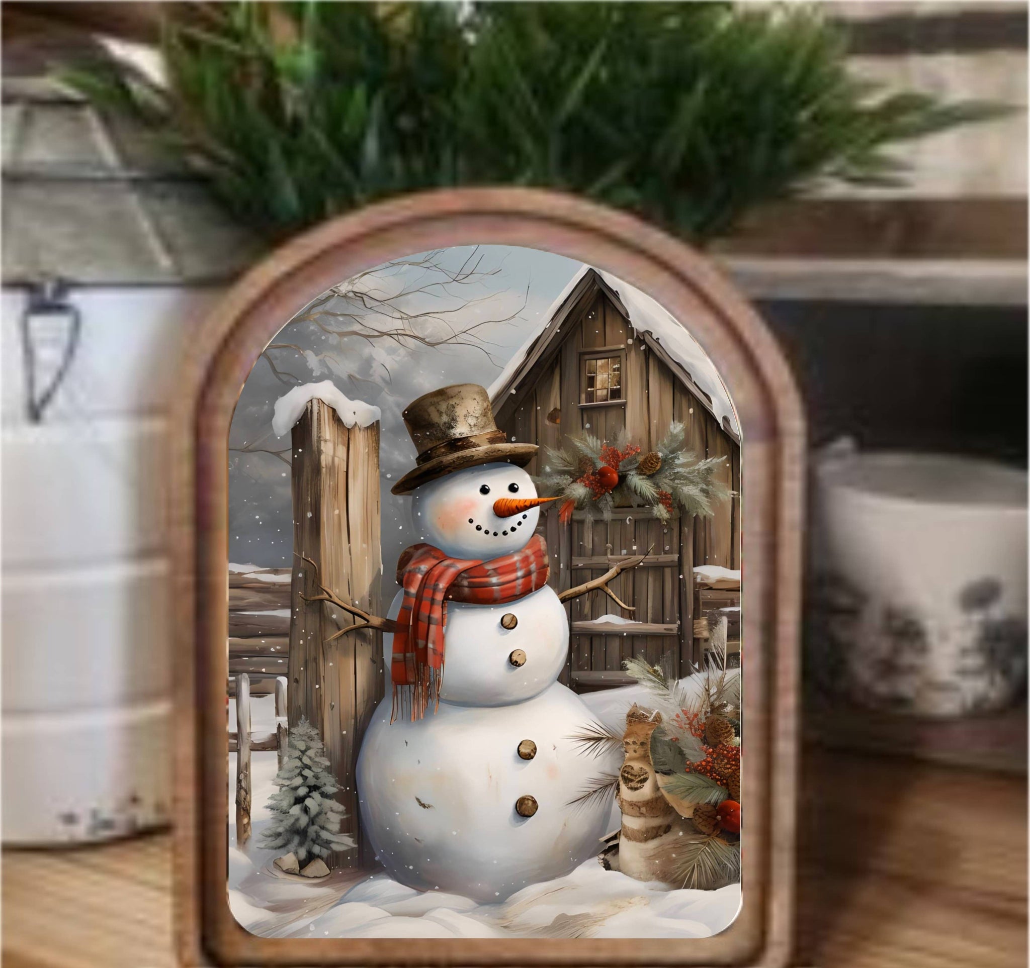 Arch Top Rustic Snowman Framed Art