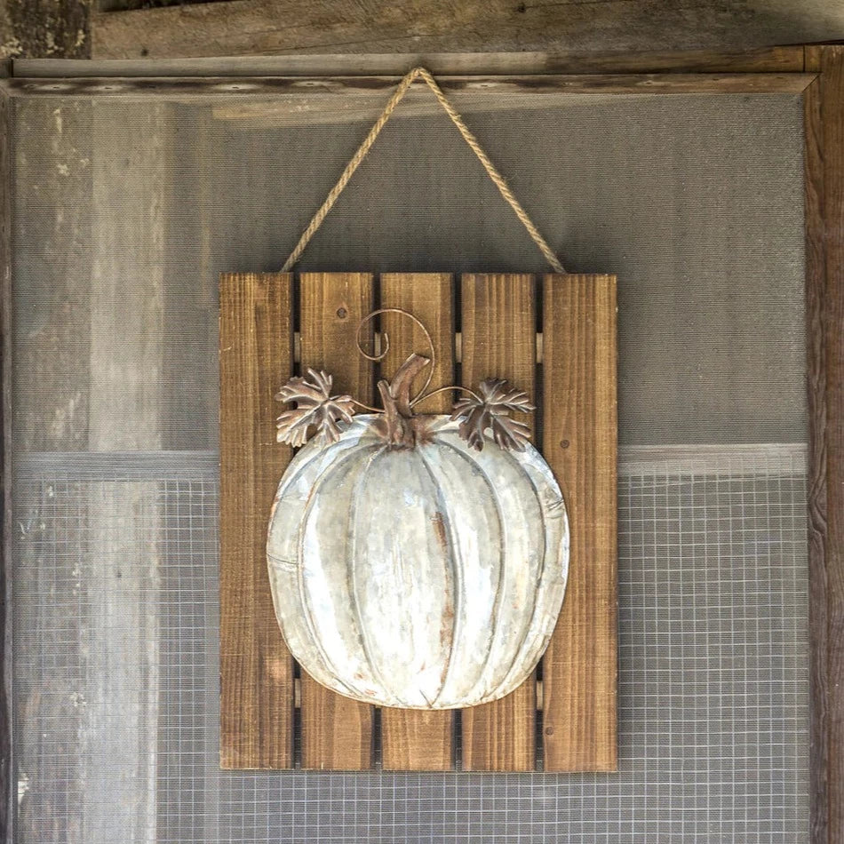 Add a touch of rustic autumn charm with this embossed metal pumpkin affixed to a wooden door plaque.
