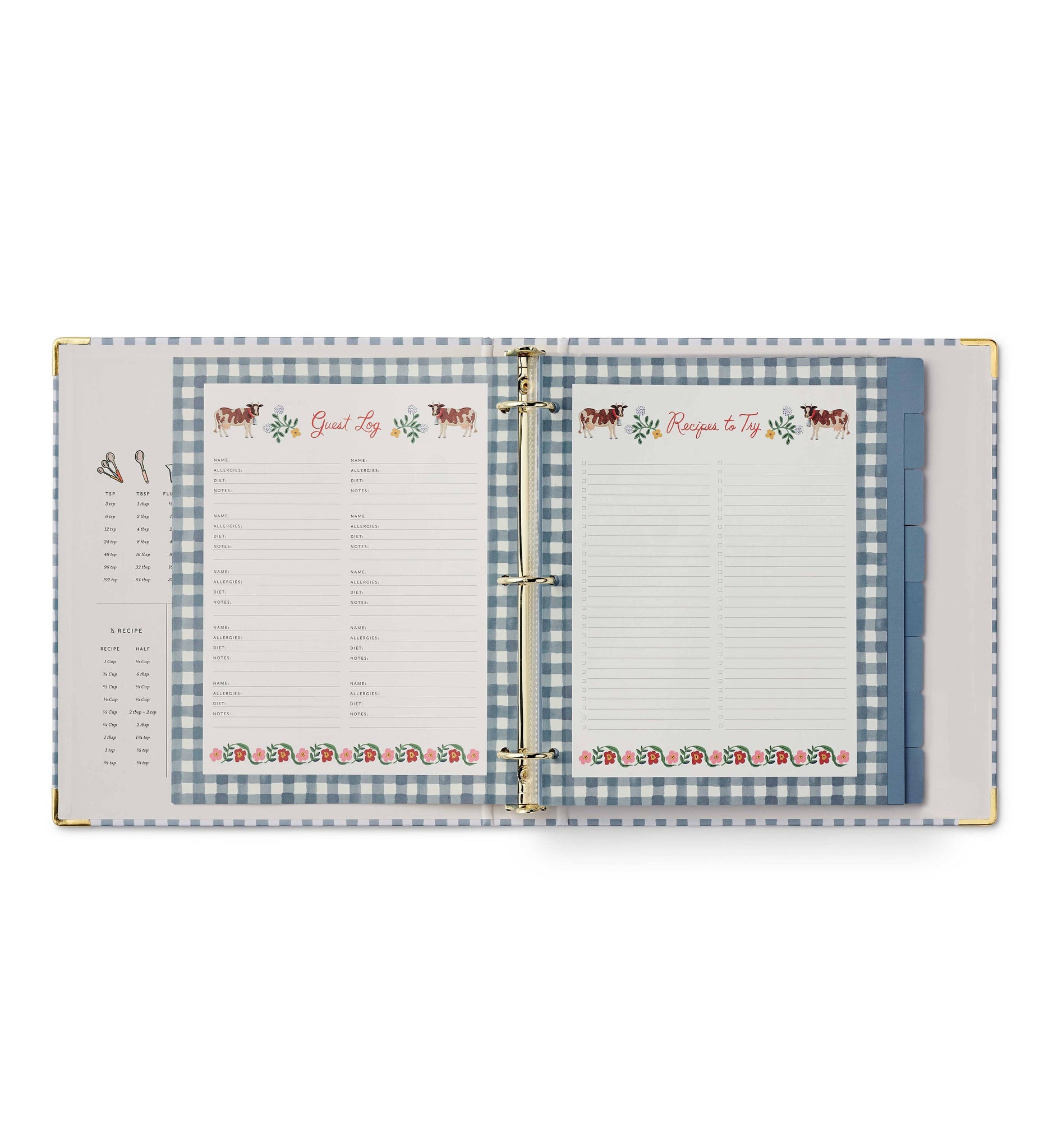 A recipe binder that’s both a resource and a keepsake. It’s a place to organize family favorites and new meals to try, complete with helpful details to keep you organized in the kitchen. The three-ring binder features gold foil accents, reinforced metal corners, a double-sided pocket folder, 16 tabbed dividers, 10 clear recipe card sleeves, adhesive labels, and illustrated reference pages.