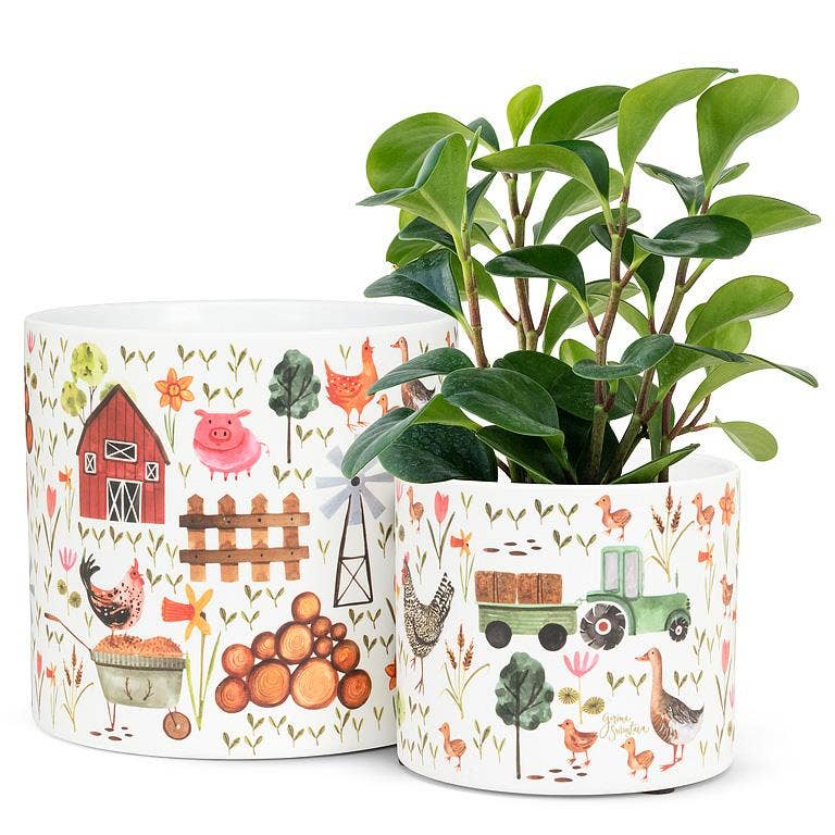 Featuring the same nostalgic farm-themed imagery, this smaller version of the ceramic planter suits succulents, herbs, or compact indoor greenery.