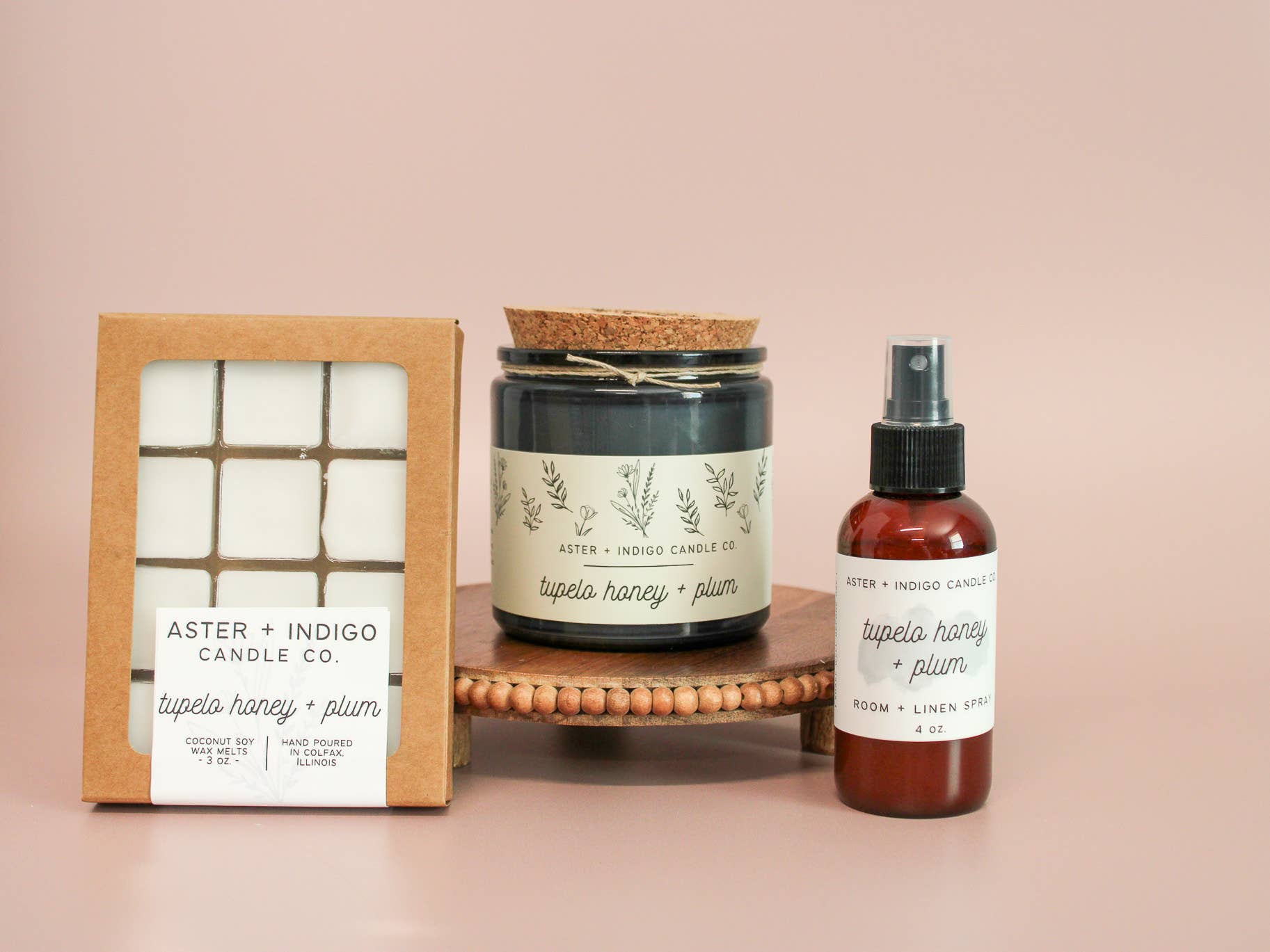 Experience the delicious accord of our Tupelo Honey + Plum candle. The top notes of orange peel are complemented by the heart notes of butter, honey, walnuts, and plum, all enhanced by a base of vanilla, sugar, and cinnamon. | Made with 100% USA grown soy, phthalate-free/Prop 65 compliant fragrances + lead/zinc free cotton wicks | Hand poured in small batches to ensure quality + consistency with each product | This attractive, eco-friendly recyclable glass jars + custom burned cork lids are perfect for upcycling + repurposing throughout the home | 12oz filled weight | Approx. burn time - 60 hours